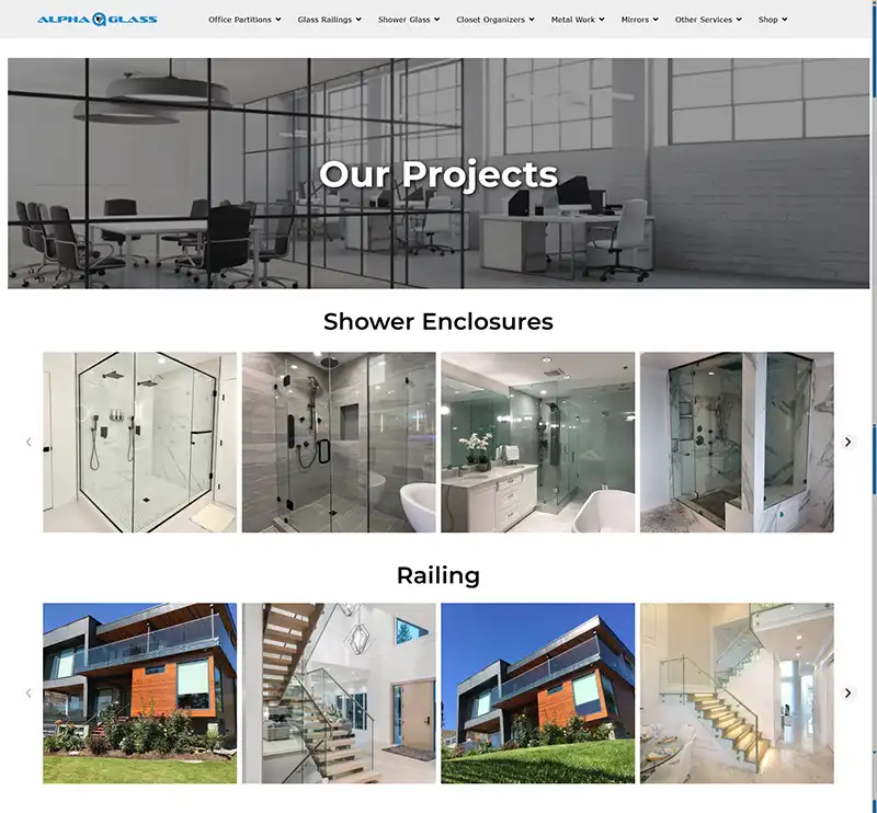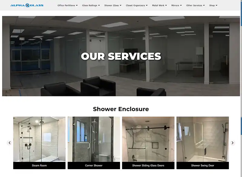 Simplified a vast service list into clear silos: Office Partitions, Glass Railings, Shower Doors, and Custom Mirrors.