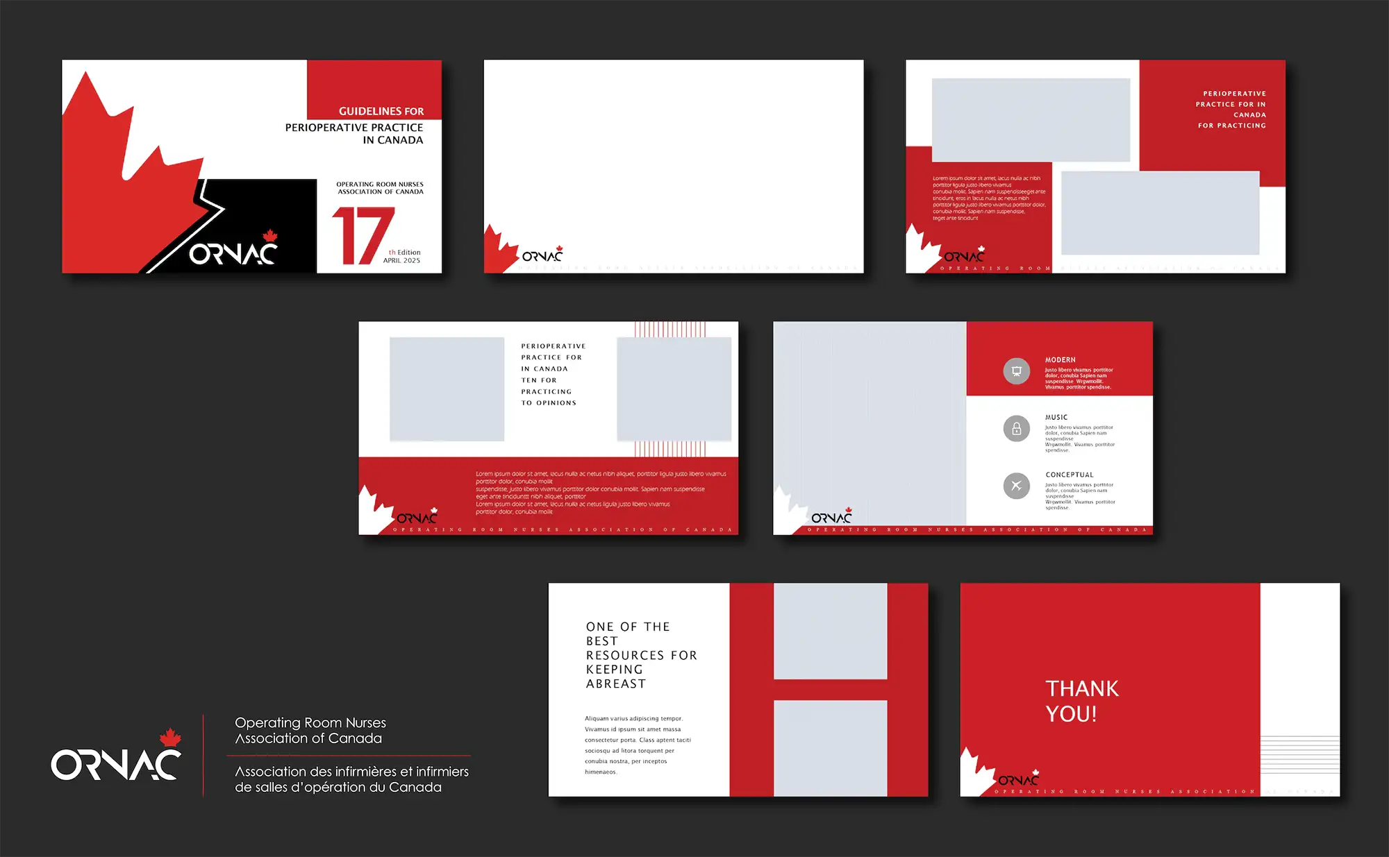 The color palette is rooted in Canada’s visual identity, featuring a deep, muted ORNAC Red complemented by black and white for clarity and professionalism.